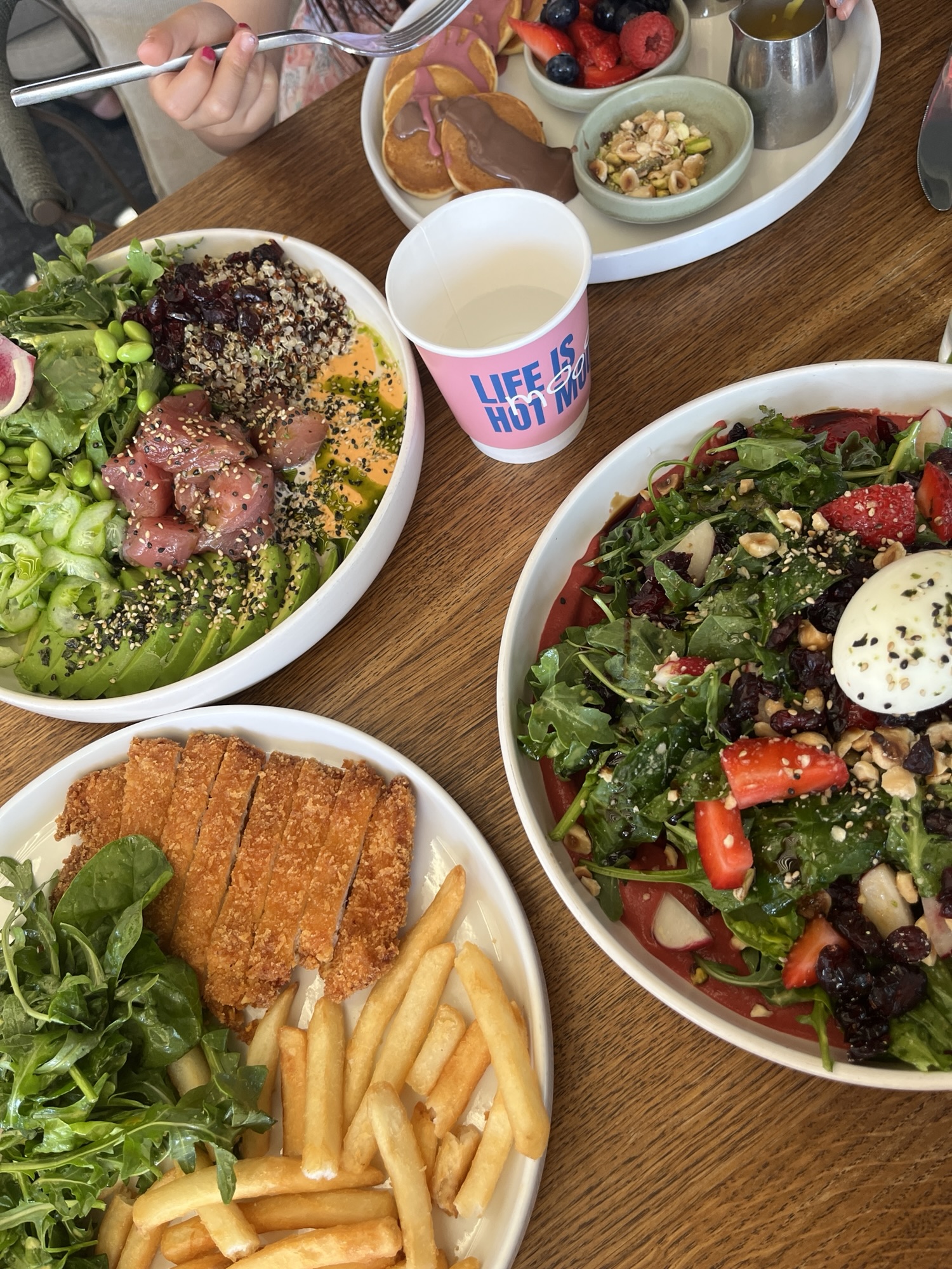 メニューは健康的で鮮やかな料理が多く、キッズメニューもある。