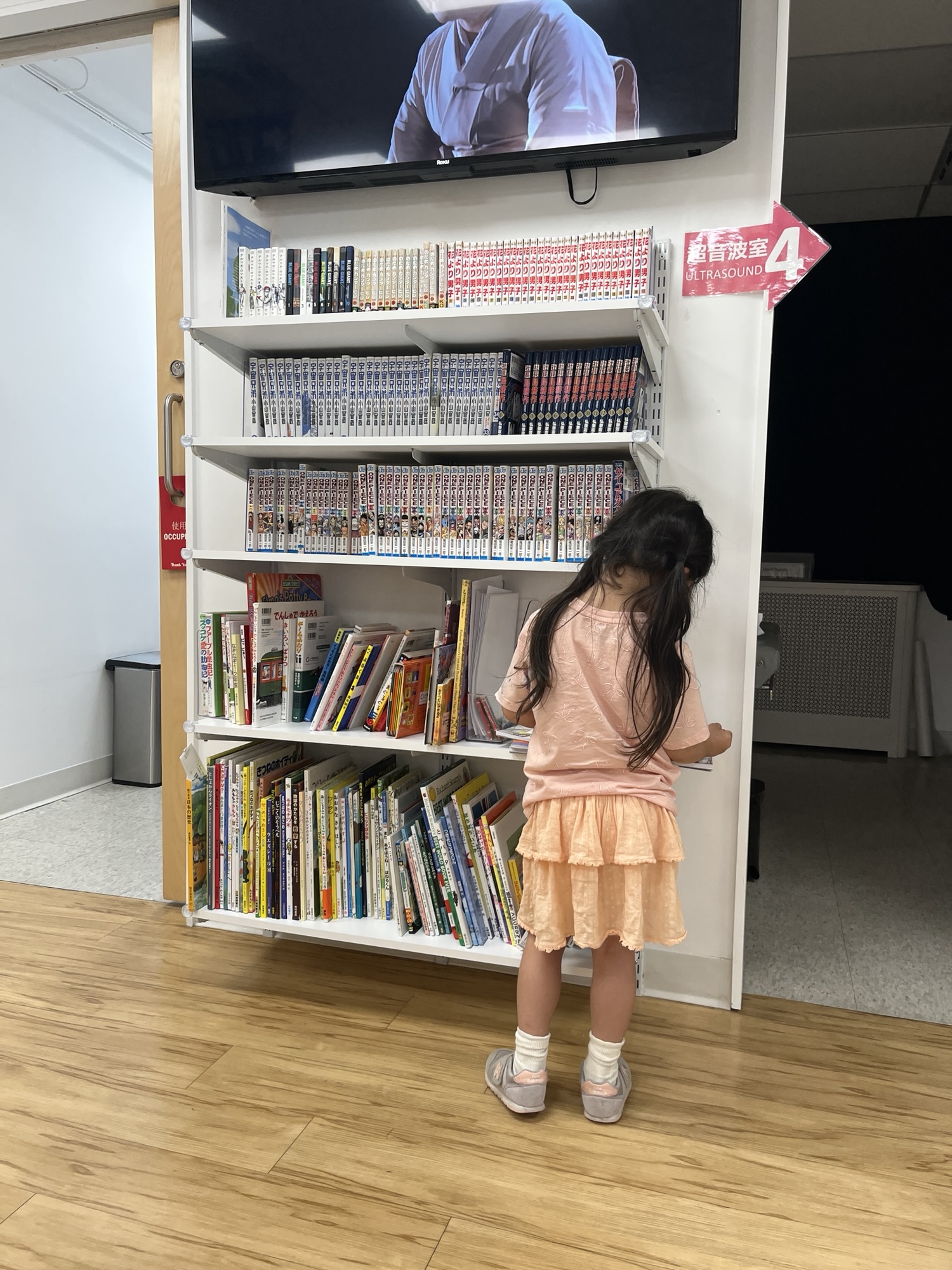 絵本・漫画コーナーもあり、塗り絵セットも用意されてるので子供も退屈しない。